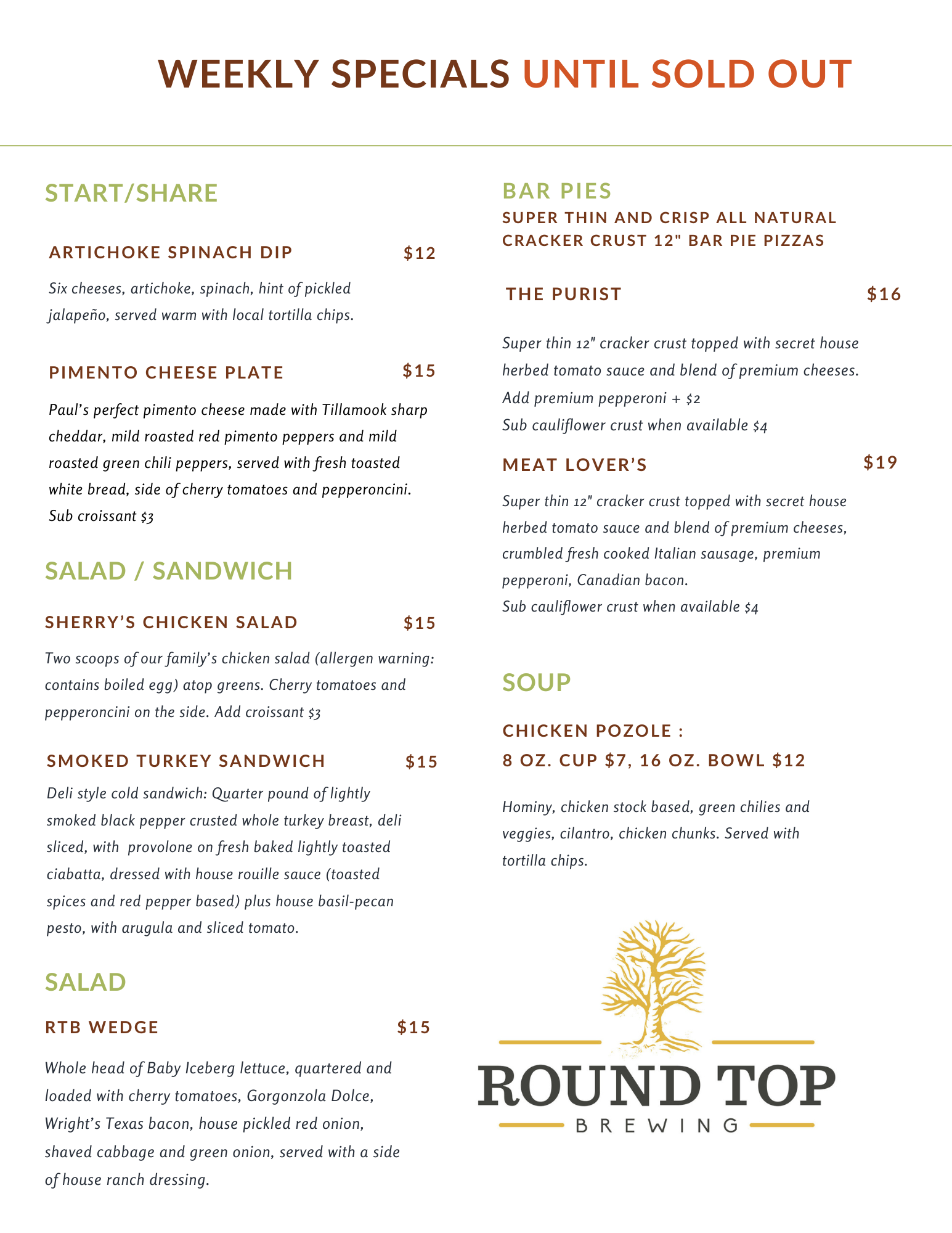 Our base menu remains seasonal with some changes and our specials menu changes daily, offered until sold out. Please see samples of menus below. Please text “menu” to 512-294-8641 for our current selections and specials.